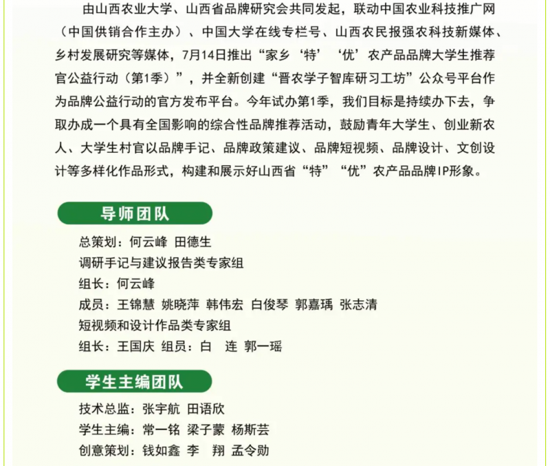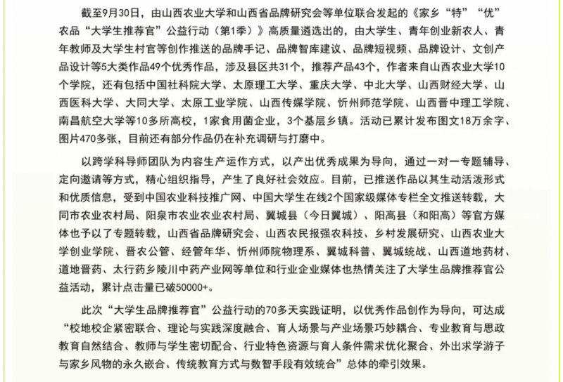 山西農(nóng)業(yè)大學(xué)、山西省品牌研究會舉辦農(nóng)產(chǎn)品品牌大學(xué)生推薦官公益行動 2025.08.04