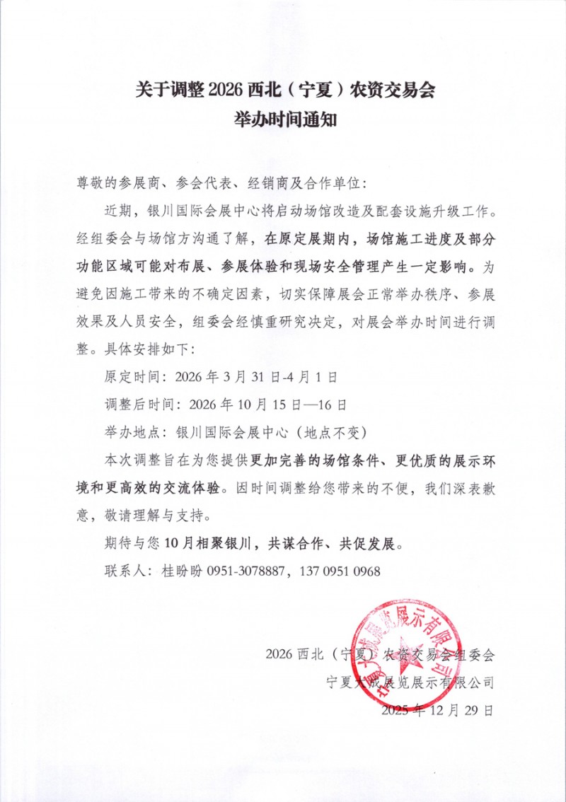 關(guān)于調(diào)整2026西北(寧夏)農(nóng)資交易會(huì)舉辦時(shí)間通知