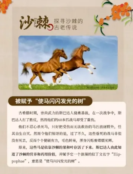 關于沙棘的傳說,更添了幾分傳奇色彩。古希臘時期,斯巴達人發(fā)現(xiàn)受傷的戰(zhàn)馬啃食沙棘果后,竟能慢慢恢復體力、毛色發(fā)亮,于是把這種植物叫做“讓馬閃閃發(fā)光的樹”,這便是“沙棘”學名的由來。而在我國元代,成吉思汗西征時,將士們因為水土不服紛紛病倒,最后靠著吃沙棘果才好轉(zhuǎn),沙棘也因此被封為“圣果”,成了行軍路上的“健康守護者”。